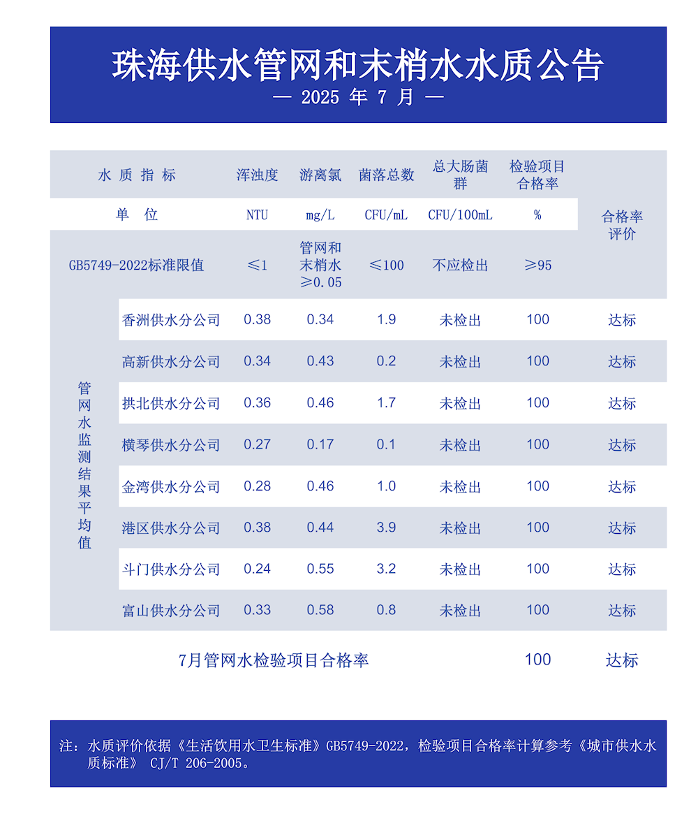 2025年7月珠海供水管網(wǎng)和末梢水水質(zhì)公告 發(fā)布時(shí)間:2025年08月14日 瀏覽次數(shù): 次 小大 原文下載:2025年7月珠海供水管網(wǎng)和末梢水水質(zhì)公告.doc 【打印正文】