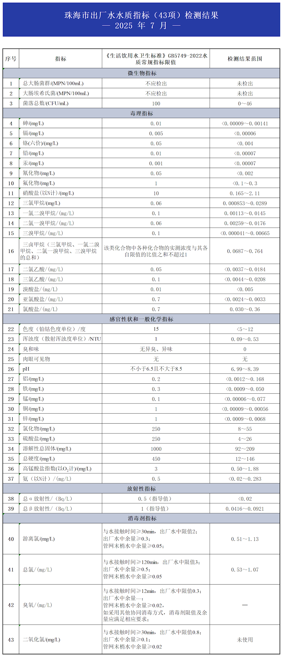 2025年7月珠海市出廠水水質(zhì)指標(biāo)(43項)檢測結(jié)果 發(fā)布時間:2025年08月14日 瀏覽次數(shù): 次 小大 原文下載:2025年7月珠海市出廠水水質(zhì)指標(biāo)(43項)檢測結(jié)果.xls 【打印正文】