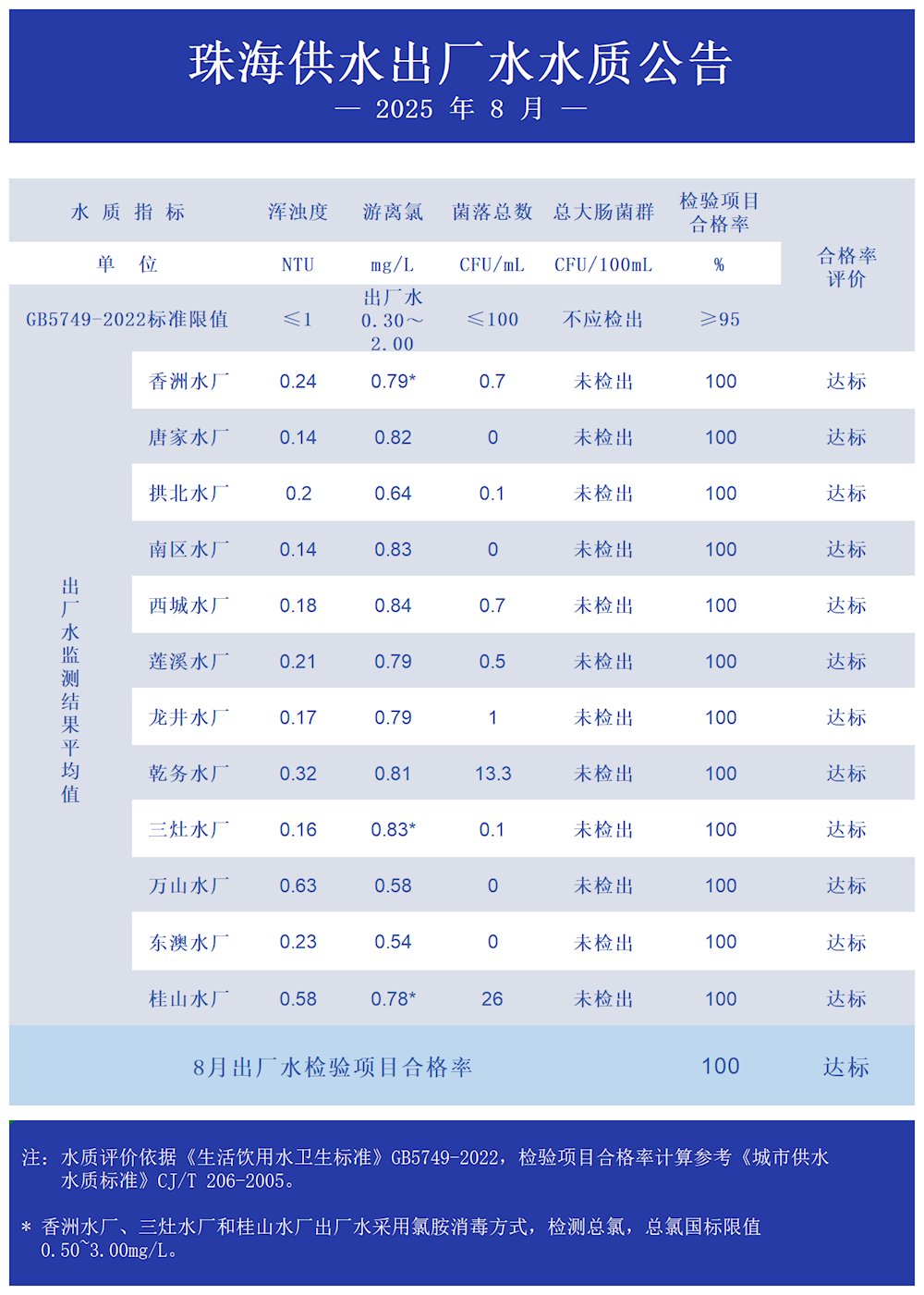 2025年8月珠海供水出廠水水質(zhì)公告