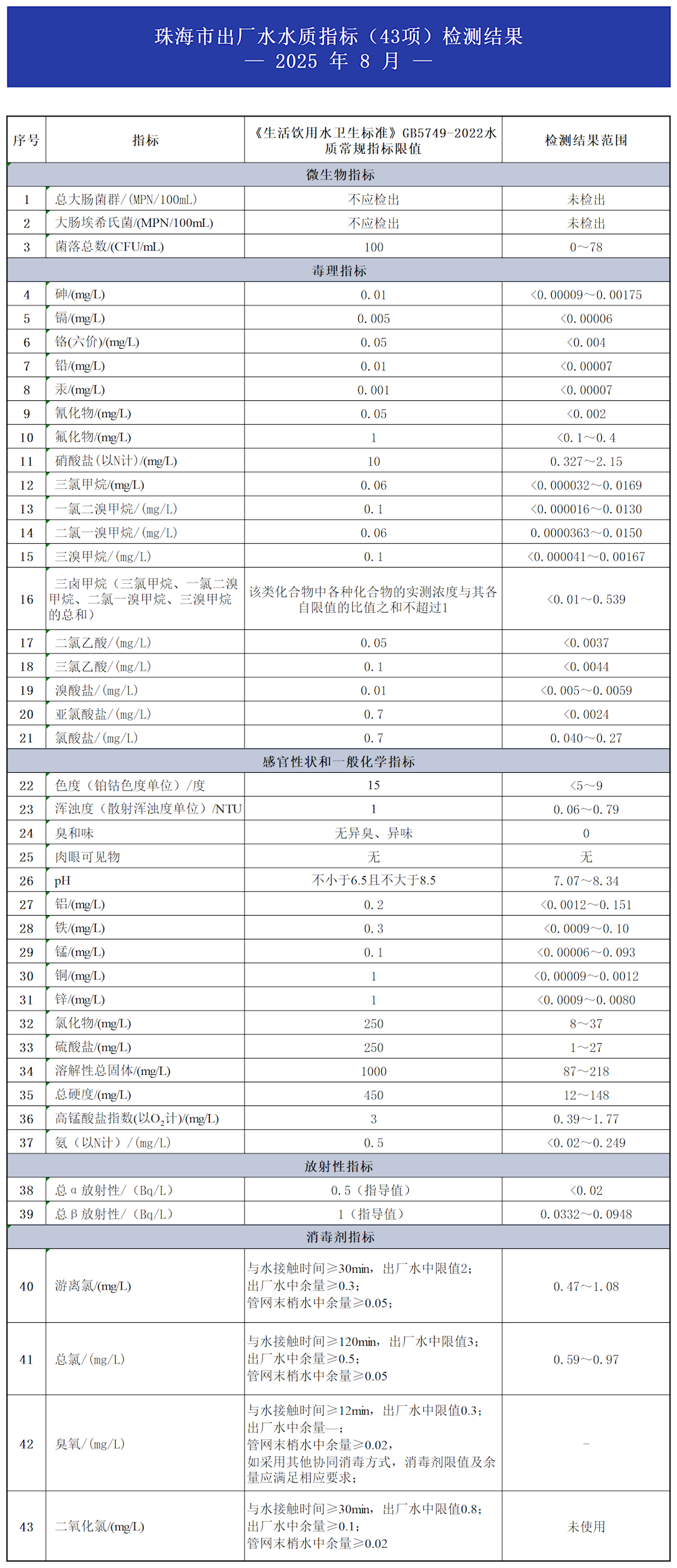 2025年8月珠海市出廠水水質(zhì)指標(biāo)(43項(xiàng))檢測(cè)結(jié)果 發(fā)布時(shí)間:2025年09月15日 瀏覽次數(shù): 次 小大 原文下載:2025年8月珠海市出廠水水質(zhì)指標(biāo)(43項(xiàng))檢測(cè)結(jié)果.xls 【打印正文】