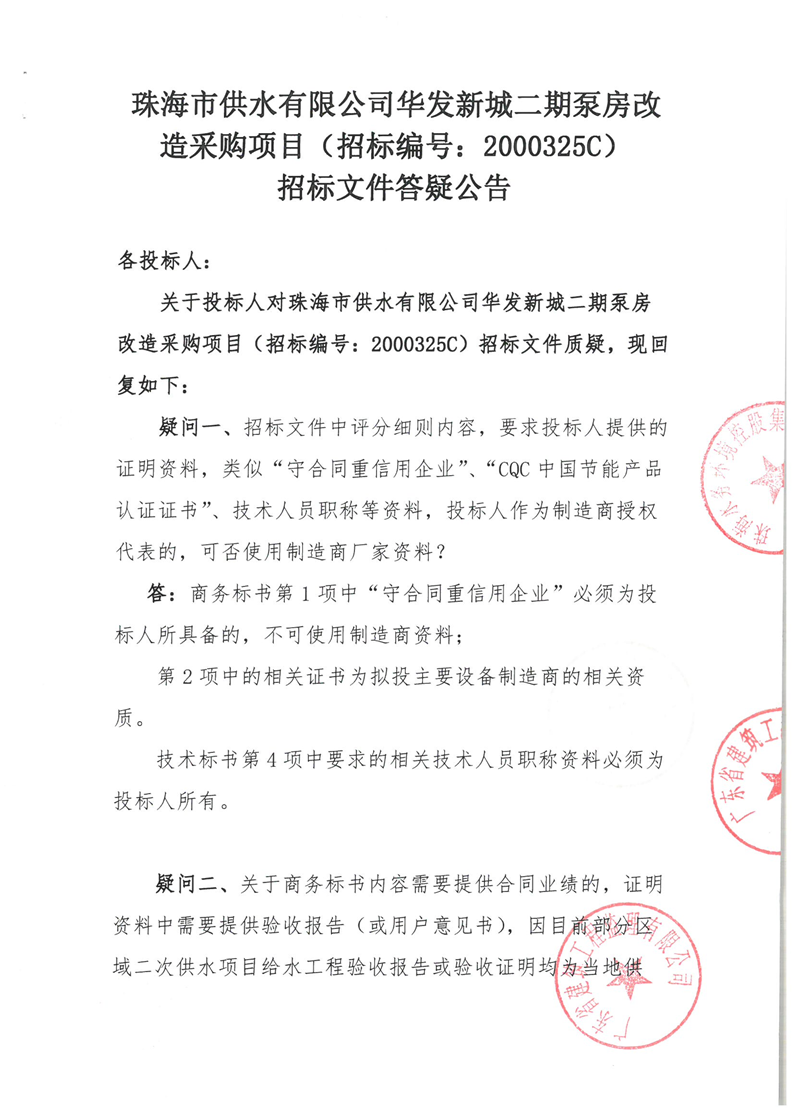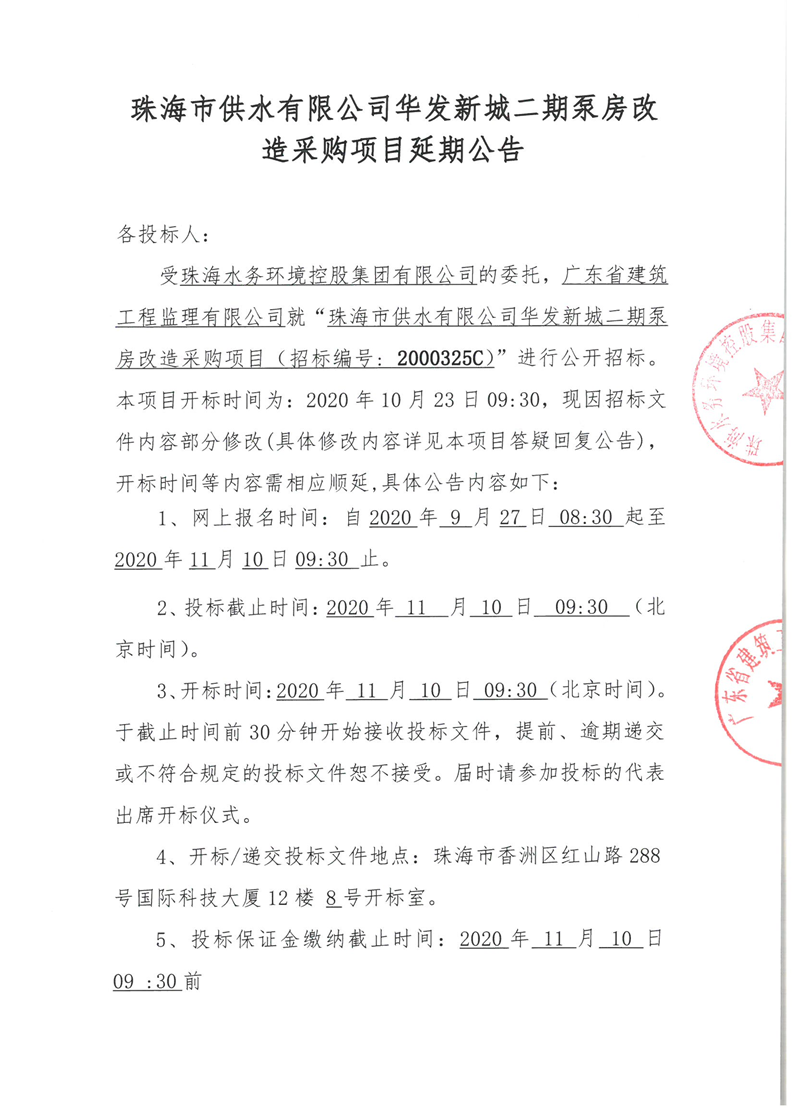 珠海市供水有限公司華發(fā)新城二期泵房改造采購(gòu)項(xiàng)目延期公告