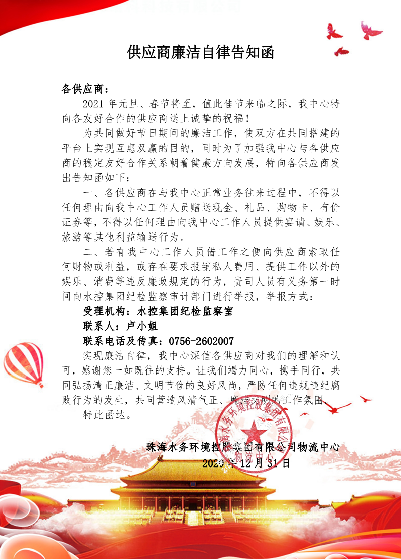供應(yīng)商廉潔自律告知函